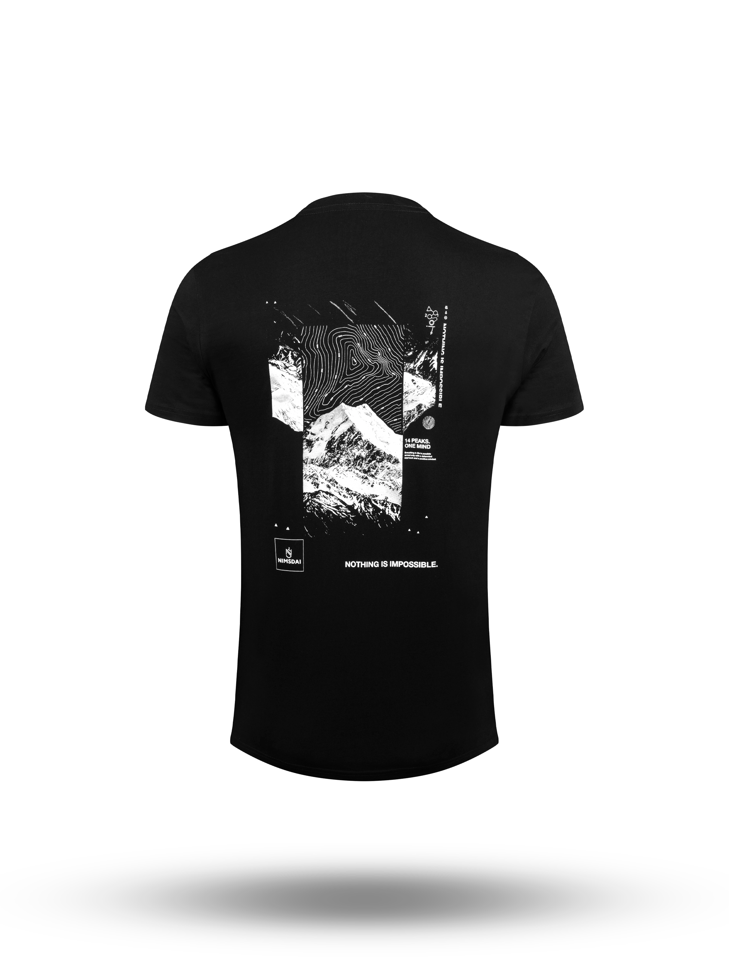 Clean on the front, the back features a striking multi-panel graphic that combines raw mountain imagery with precision topographic lines capturing the intersection of nature and data.