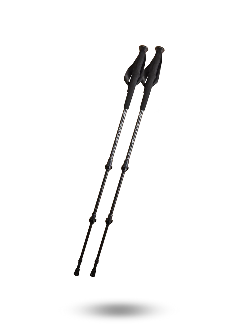 The Ultralight carbon fibre trekking poles. This adjustable system features two sections, which can be expanded or collapsed as needed depending on height. The handle has been developed with an anti-shock system that can be locked or unlocked. When unlocked the anti-shock system will be activated and provide comfort for steep decent taking most of the impact. When locked, the trekking pole works just like a normal trekking poles. The system is easily activated by twisting the top of handle.